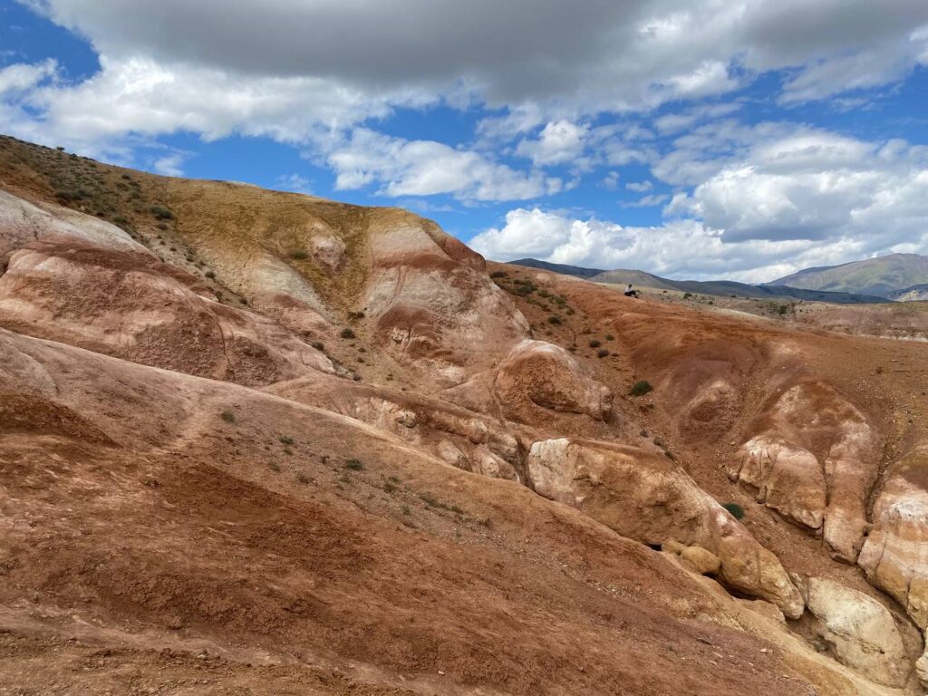 И вот мы спускаемся с гор снова на Чуйский тракт, едем на базу «Кочевник». По дороге заезжаем на местные достопримечательности — Марс и Гейзерово озеро. Но кое-что кардинально изменилось — мы теперь команда! 🤝✨