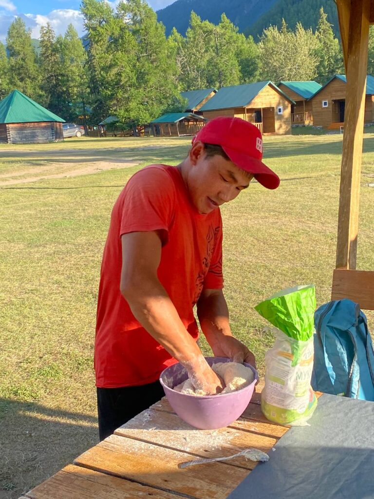 Представьте картину: берег Чуи, я расставила палатку, порадовалась солнышку и теплу внизу по сравнению с горами, переоделась в шорты и иду к нашей беседке. Иииии… вижу Андрея, который МЕСИТ ТЕСТО. 🍞👨‍🍳