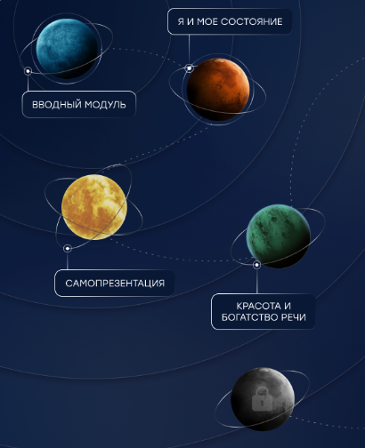 Курс состоит из двух равнозначных частей. Первая — это распаковка себя, вторая — работа с голосом. Темп при этом ненапряжный и позволяет основательно погрузиться в себя, действительно проработать и структурировать свои качества и знания.