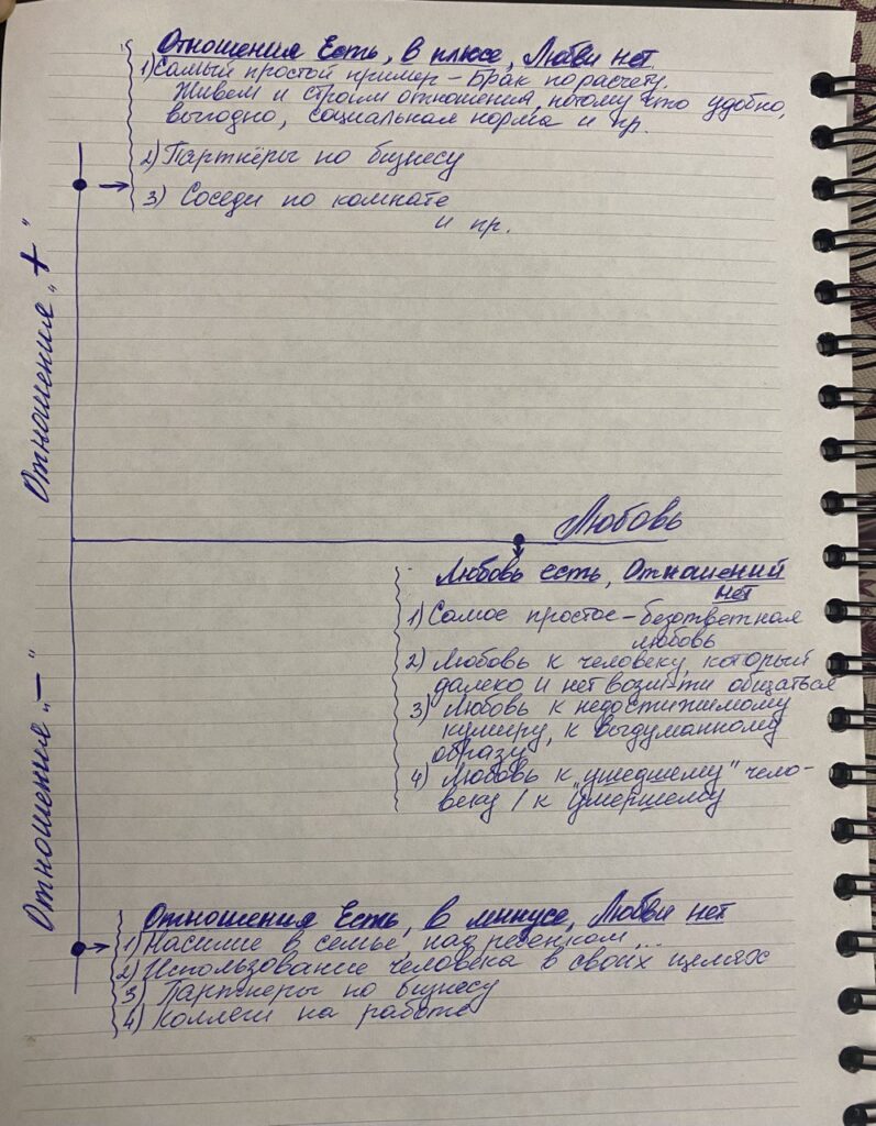 *** Пока писала статью, поняла, что напротив Любви можно сделать ось Ненависть. Отношения ведь строятся и из Ненависти. Например, месть. Эту мысль надо еще подумать.