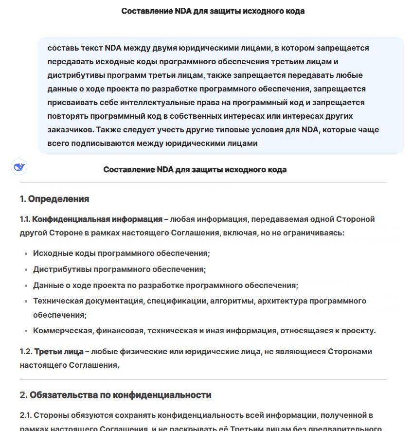 Сначала стала давать маленькие запросы на написание текста о преимуществах компании, пару раз посоветовалась, что делать в кризис, для личного интереса. Дала задания сотрудникам составить описания программных продуктов для внутренних обучений. И вот наиболее интересный запрос из тех, что я пробовала, это было написание NDA между ИнфоСАПР и нашим подрядчиком о нераспространении информации.