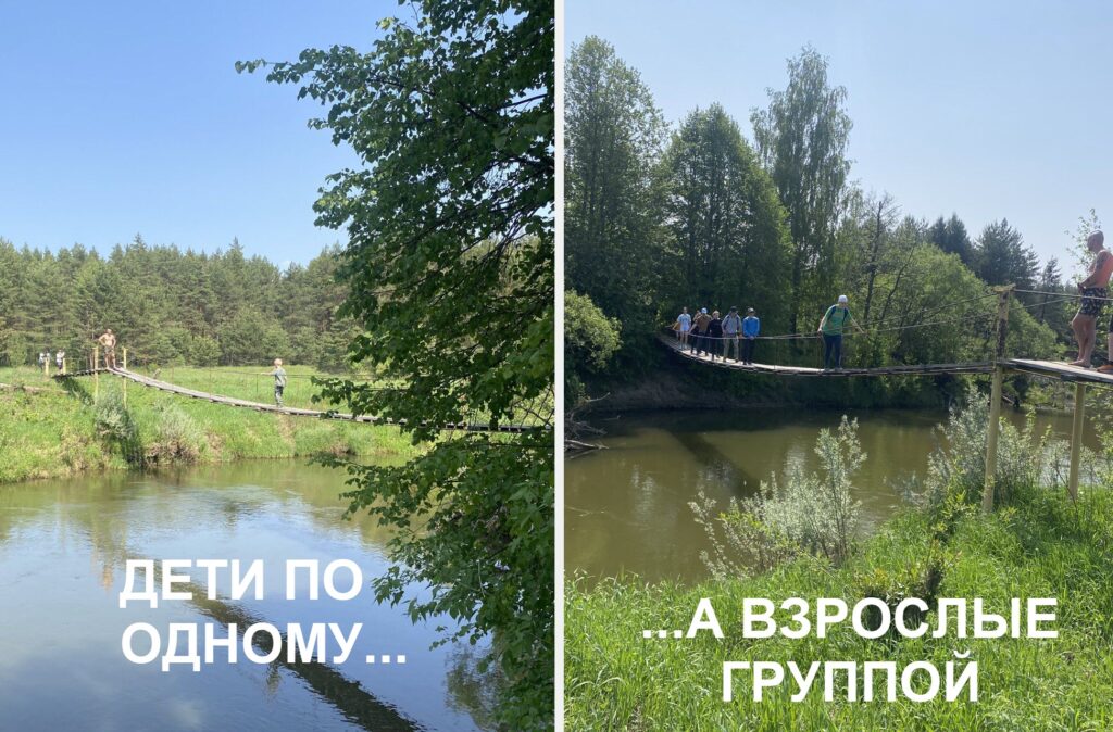 Ещё этот поход мы совместили с пешей частью. Немного, 6 км всего, но это было интересно. По пути дети прошли обряд инициации на подвесном мосту, я так это назвала про себя. Каждый по отдельности переходил мост, полностью самостоятельно. Мне порой приходилось тащить свою ношу (Митю) на себе, ну да ничего, дошли.