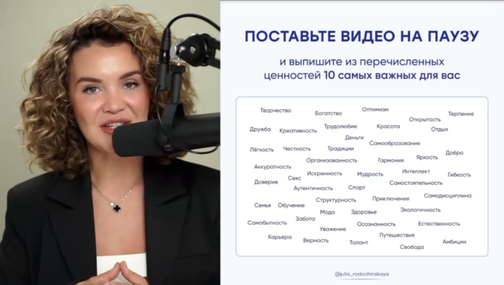 Надо выбрать 10 слов, которые ваше сознание выхватило из разбросанного списка, а потом подумать и оставить только 5 самых важных. Я выбрала и оставила вот эти: Структурность, Осознанность, Честность, Открытость, Оптимизм.